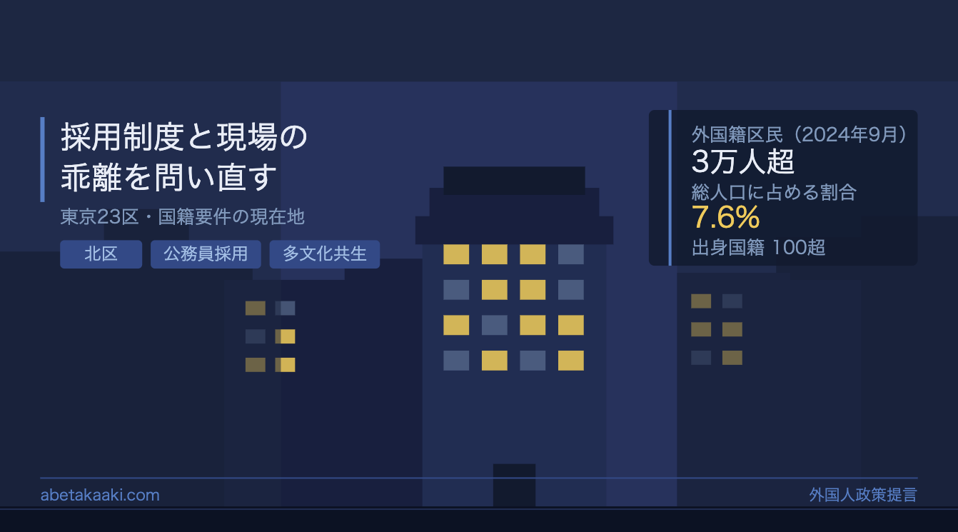 北区の現場で本当に必要なのは、教育、福祉、生活相談、防災、窓口案内、地域との調整など、住民サービスの質を上げることです。現に北区自身が多言語対応や地域との接点づくりを施策に盛り込んでいる以上、そこを担う人材の入口が狭いままでよいのかは、当然に検証されるべきです。