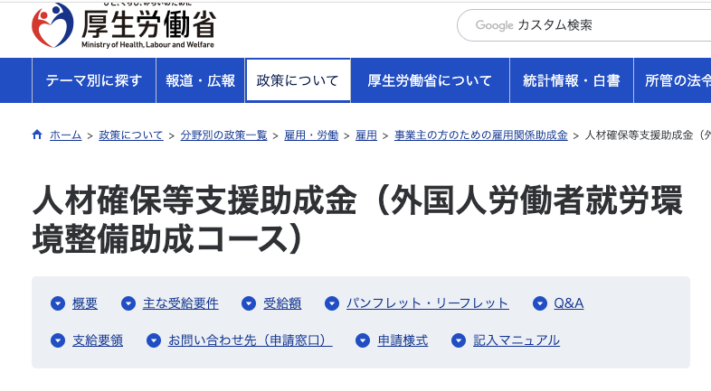 厚生労働省が運用している、外国人雇用に特化した全国制度の中心は、「人材確保等支援助成金(外国人労働者就労環境整備助成コース)」。