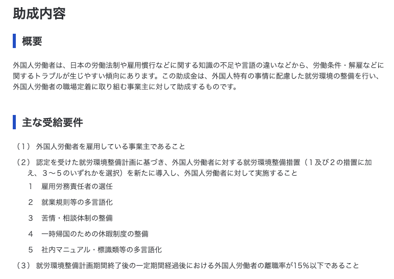 厚労省の説明では、対象となるのは、雇用労務責任者の選任、就業規則等の多言語化、苦情・相談体制の整備、一時帰国休暇制度の整備、社内マニュアルや標識類の多言語化といった、企業側の受入体制整備です。